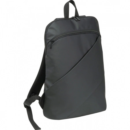 Plecak wykonany ze sztucznej skóry z dwoma ukośnymi kieszeniami, zapinanymi za zamek z przodu, uchwytem do przenoszenia, watowanymi szelkami i kieszonką antykradzieżową.