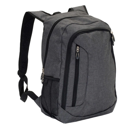 Dwukomorowy plecak miejski. Wykonany z wytrzymałej tkaniny o splocie oxford, 100% poliester powlekanej PVC. Wyposażony w tradycyjne zamki. Dodatkowo posiada 1 kieszeń z przodu oraz 2 boczne, wykonane z siateczki. Na szelkach naszyte są paski z odblaskowego materiału. Pojemność 20 litrów.