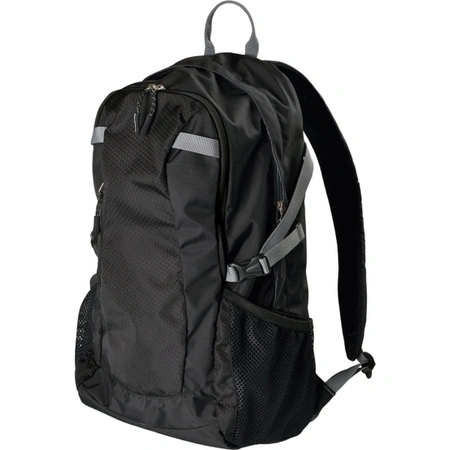 Plecak posiada watowane plecy i szelki z uchwytami, praktyczną kieszeń z zabezpieczeniem na laptop, dwie kieszenie na butelki, taśmy kompresyjne, kieszeń na buty, kieszeń wewnętrzną z przedziałką na drobiazgi oraz karabińczyk. Materiał: 300D nylon, dobby