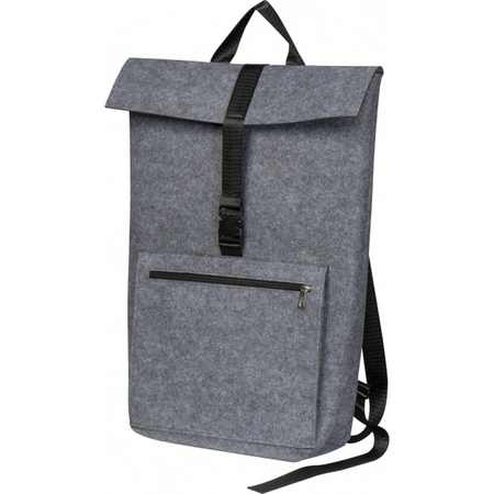 - Wysokiej jakości plecak wykonany z filcu pochodzącego z recyklingu. Oprócz pojemnej wewnętrznej przegrody z regulowanym zamknięciem, posiada zapinaną na zamek przednią przegrodę i regulowane, wyściełane paski na ramiona.