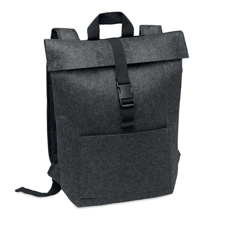 Plecak filcowy RPET z bawełnianym paskiem zapinanym na klamrę i kieszenią zapinaną na zamek z przodu. Posiada przegrodę na laptopa.