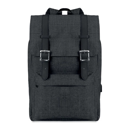 - Plecak na laptop z poliestru 600D z wyściełanymi paskami na ramiona, główna komora na laptop 15-calowy, kabel USB do ładowania. Zawiera zapięcie na zatrzask magnetyczny i jedną przednią kieszeń zapinaną na suwak.