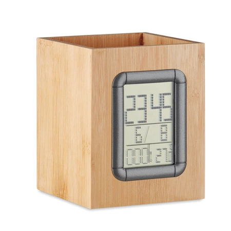 Bambusowy pojemnik na długopisy z kalendarzem, budzikiem i termometrem. Dołączone 2 baterie. Bambus jest produktem naturalnym, dlatego mogą wystąpić nieznaczne różnice w kolorze, wzorze i rozmiarze.