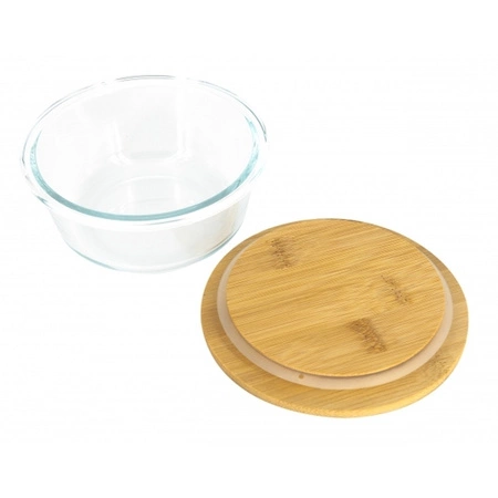 - Szklana miska o pojemności 300 ml wykonana ze szkła, posiada zamknięcie w postaci bambusowej pokrywki.