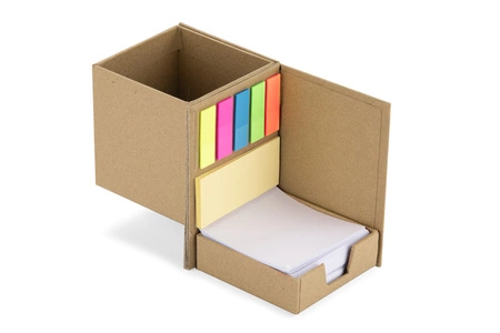 - Przybornik na biurko KOS to funkcjonalny gadżet reklamowy wykonany z papieru kraftowego. W wersji złożonej pełni rolę eleganckiego stojaka na przybory biurowe, co pozwala na zachowanie porządku na biurku. Po rozłożeniu odkrywa zestaw karteczek samoprzylep