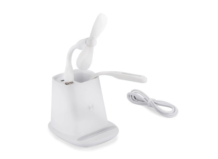 Przybornik na biurko BERGO to idealny gadżet do pracy z ładowarką bezprzewodową, stojakiem na telefon, portem USB i USB typu C. Może także działać jako hub. Dane techniczne: USB typu C: 5V/2A, ładowarka bezprzewodowa: 5W, 2 wyjścia: USB typu A i USB typu