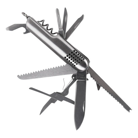 - Doskonały 13-funkcyjny scyzoryk. Wykonany ze stali nierdzewnej. Pakowany w poliestrowe etui. Zawiera: 1) piła, 2) pilnik jednorzędowy, 3) nożyczki, 4) skrobak do ryb z końcówką do haczyków, 5) nóż, 6) otwieracz do butelek, 7) wkrętak płaski, 8) oczko do t