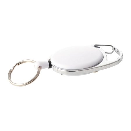 - Wykonany z metalu i plastiku ski-pass z karabińczykiem, metalowym kółkiem i klamrą do paska. Długość linki 86 cm.