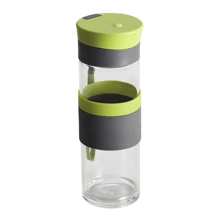 - Szczelny bidon o pojemności 440 ml. Wykonany ze specjalnego szkła borokrzemowego, które jest nadzwyczaj przyjazne naszemu zdrowiu, a także lżejsze od tradycyjnego szkła. Bidon wyposażony jest w uchwyt na nadgarstek, opaskę do trzymania oraz szczelne zamkn