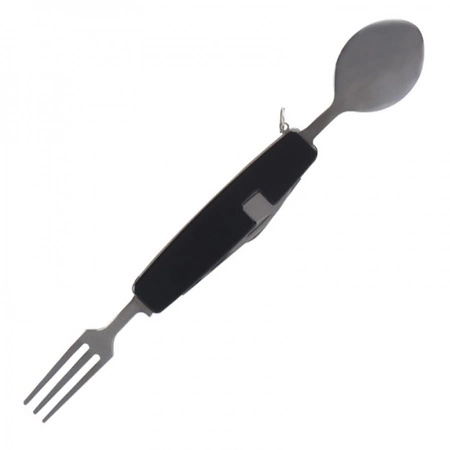 - Sztućce kempingowe wykonane ze stali nierdzewnej, cztery rozkładane elementy: łyżka, widelec, nożyk i otwieracz do butelek.
