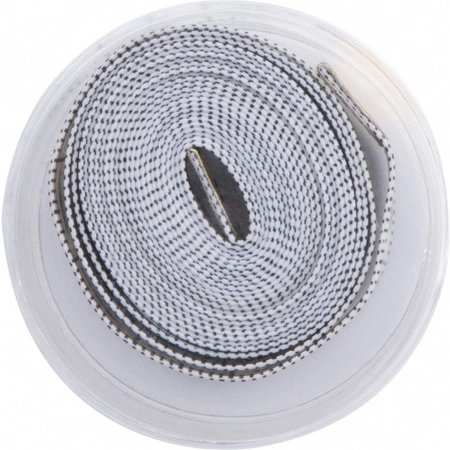 Gumowa taśma miernicza o długości 1,5 m schowana w plastikowym pudełku. Dostępna jest w białym kolorze.