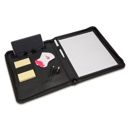Elegancka teczka A4 wykonana z ekoskóry, zamykana na zamek. Zawiera notes, dwie małe kieszonki, elastyczny uchwyt na telefon oraz składany stojak do telefonu. Teczka posiada również miejsce na długopis.
