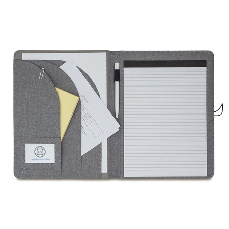 Teczka A4 z okładką wykonaną z poliestru z recyklingu. Zawiera notes w linie, trzy duże przegrody, kieszonkę na wizytówki oraz uchwyt na długopis. Teczka zapinana jest na gumkę zaczepianą o metalowy haczyk.