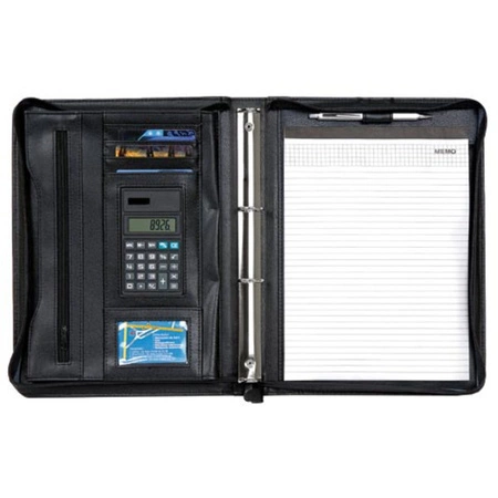 - Wykonana z ekoskóry czarna teczka konferencyjna z poręcznym uchwytem. Wyposażona w kalkulator, wkład papierowy A4, metalowy ring, kieszonkę z zamkiem oraz uchwyt na długopis. Posiada także kieszonki na wizytówki oraz przegródki na dokumenty. Kalkulator za