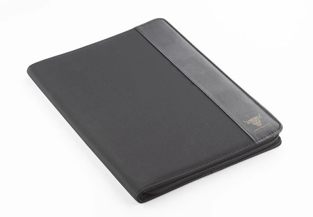 - Teczka z mikrofibry i poliestru 600D z dużą kieszenią, kieszenią na zamek, 2 portami USB, kieszonkami, miejscem na długopis i notesem. Logo wygrawerowane na teczce.