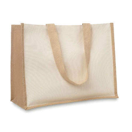 Jutowa torba na zakupy, wewnątrz laminowana, z zewnątrz płócienna. Posiada długie, bawełniane uchwyty.
