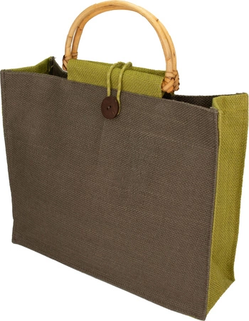 - Ekologiczna torba na zakupy wykonana z juty z uchwytami bambusowymi i zapięciem na guzik.