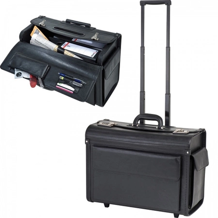- Walizka na dokumenty wykonana ze skóry ekologicznej, została wyposażona w kółka i długi teleskopowy uchwyt.