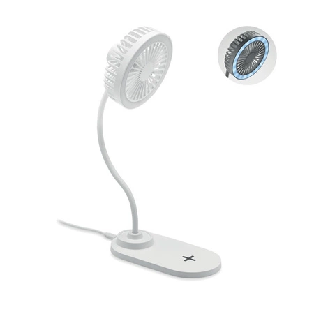 - Biurkowy wentylator z ABS z 3 poziomami prędkości, z lampą LED (80 lumenów) i z bezprzewodową ładowarką 10W. Wyjście: DC 9V/1.1A (10W) do szybkiego ładowania.