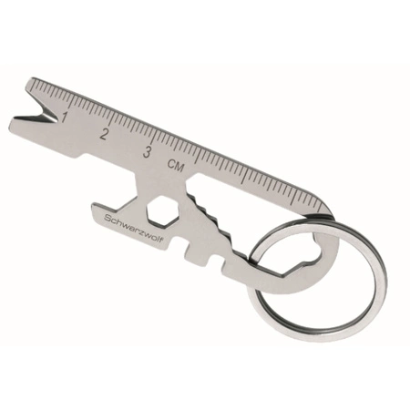 - Wielofunkcyjny brelok marki Schwarzwolf zawierający 13 różnych narzędzi, w tym linijkę, magnes, klucz w 6 rozmiarach oraz otwieracz do butelek.