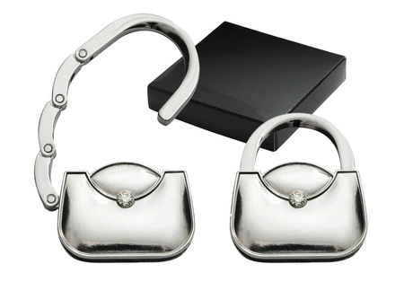 - Elegancki wieszak na torebkę w kształcie damskiej torebki z metalu, ozdobiony szkiełkiem. Pakowany w czarne pudełko, z możliwością znakowania grawerem.