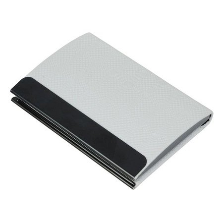 - Etui na wizytówki wykonane z ekoskóry o ciekawej fakturze. Wykończone metalową oksydowaną blaszką z magnesem zamykającym etui.