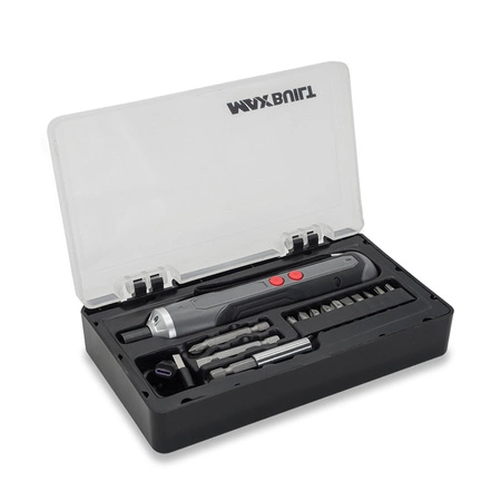 - Zestaw składa się z: wkrętaka z ergonomicznym uchwytem i dwoma intuicyjnymi przyciskami kierunkowymi, umożliwiającymi łatwe wkręcanie i wykręcanie. Zestaw zawiera także 10 końcówek w różnych rozmiarach, 4 dodatkowe przedłużki, magnetyczną przedłużkę oraz