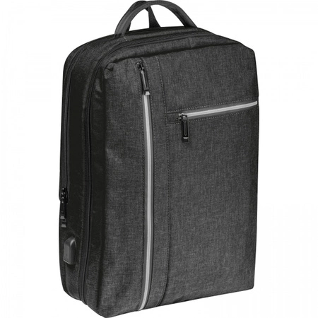 Wodoodporny plecak wykonany z nylonu, z watowanymi szelkami, przegrodą na laptopa 15,6`, wyjściem na kabel USB i dwiema przednimi kieszeniami.