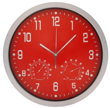 Zegary firmy CrisMa cechuje wysoka wytrzymałość i elegancki wygląd. Ten model, oprócz wskazywania godzin, pokazuje temperaturę oraz wilgotność powietrza. Estetyczna i wytrzymała obudowa, cichy mechanizm zasilany wyłącznie jedną bateria AA. Brak baterii w