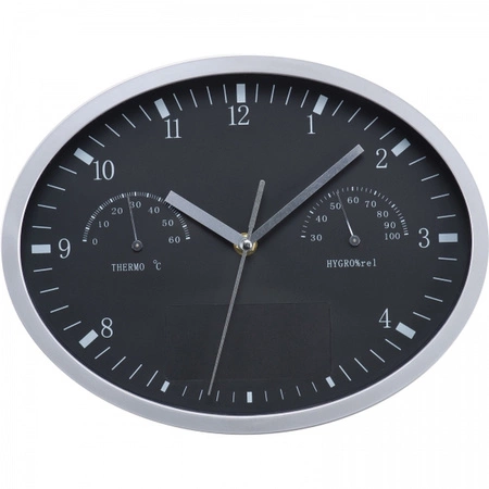 Owalny zegar ścienny z termometrem i higrometrem. Logotyp można umieścić na specjalnym panelu.