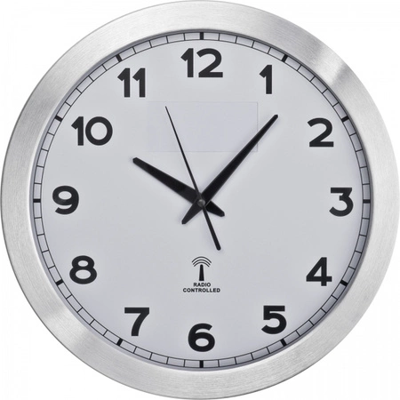 - Duży zegar ścienny z metalu i szkła, sterowany radiowo. Zegar automatycznie ustawia godzinę - wystarczy włożyć baterie i nacisnąć przycisk reset.
