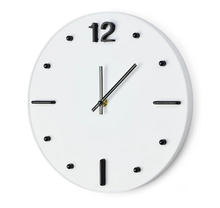 Nowoczesny zegar ścienny z kontrastowymi wskazówkami na białej tarczy. Możliwość nadruku logo. Baterie nie dołączone. Wymagana 1 szt. AA.