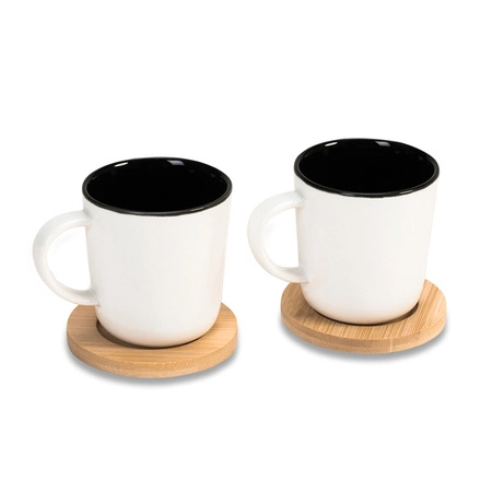 Zestaw składa się z dwóch kubeczków ceramicznych o pojemności 150 ml. Dodatkowo zawiera bambusowe podstawki, które nie tylko stanowią stylowy element dekoracyjny, ale także chronią powierzchnię.