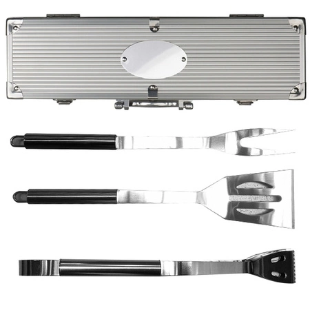 - Zestaw metalowych sztućców do grilla, zawierający szczypce do obracania mięsa, łopatkę oraz widelec. Całość umieszczona w metalowej skrzynce.