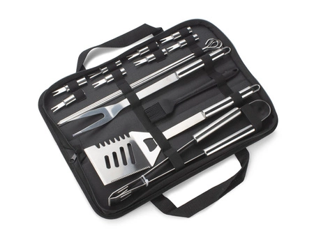 - Zestaw do grilla ROLAN w etui z 16 elementami ze stalowymi rączkami: szpikulce, szczypce, łopatka z otwieraczem, widelec, uchwyty do kolb kukurydzy i pędzelek. Idealny do grillowania na świeżym powietrzu.