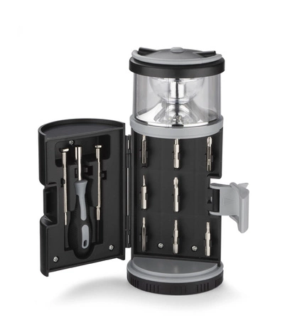 Zestaw narzędzi BARTO to praktyczny zestaw w kształcie latarni z 8 bitami, 2 śrubokrętami precyzyjnymi i lampką LED, idealny do kempingu. Uchwyt do przenoszenia, zasilany bateriami 3xAAA (brak w zestawie).