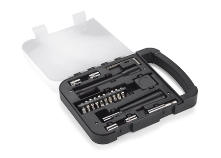 FIXO to praktyczny zestaw narzędzi z kluczem imbusowym, latarką, miarą, wkrętakiem, różnymi bitami, przedłużką i końcówkami nasadowymi. Idealny do wielu zadań!