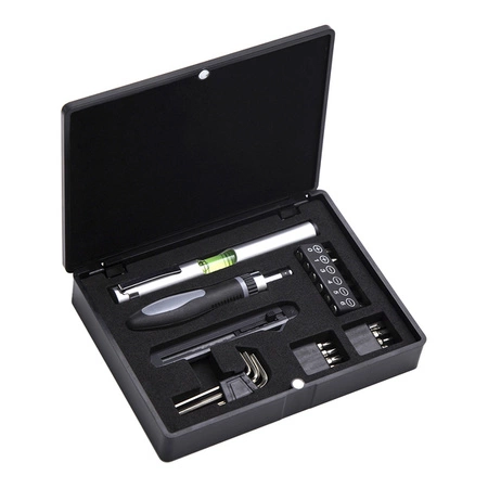 Wieloelementowy zestaw narzędzi w pudełku zamykanym na magnes. Zawiera: poziomicę z uchwytem (1/4”), uchwyt wkrętakowy (4 mm) z grzechotką, magnetyczny, wkrętak PHO (krzyżowy), – 2 rozmiary (1/4”), wkrętak płaski (1/4”) – 4 rozmiary, nóż tapicerski, wkrętak płaski – 4 rozmiary (4 mm), wkrętak PH (krzyżowy) – 4 rozmiary (4 mm), klucz imbusowy – 3 rozmiary.