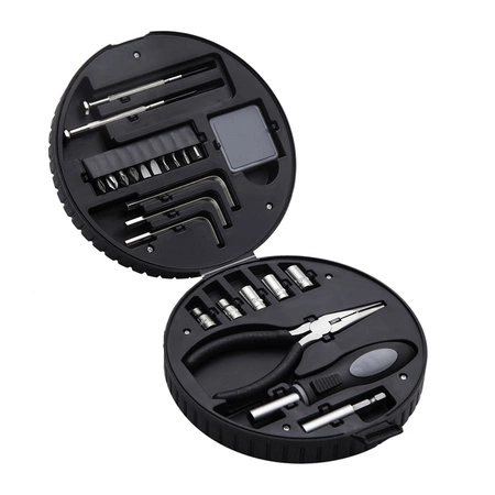 - Zestaw 24 narzędzi w opakowaniu w kształcie opony samochodowej, w skład którego wchodzą: wkrętak precyzyjny PH (krzyżowy), wkrętak precyzyjny (płaski), miara zwijana 1 m, adapter (1/4”), klucz Torx – 3 rozmiary, wkrętak płaski – 2 rozmiary, wkrętak Philli
