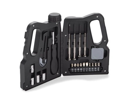 - KANNIS to zestaw narzędzi z 4 śrubokrętami, nożykiem, miarą, uchwytem, 4 kluczami nasadkowymi, przejściówką i 9 bitami, zamknięty w etui w kształcie kanistra.