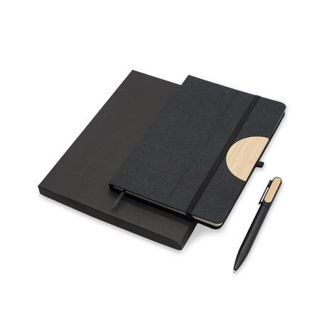 Zestaw składający się z notesu i długopisu, zdobionych bambusowymi elementami. Notes w twardej oprawie, którą można zmienić w podstawkę pod telefon. 80 kartek w linie (papier 70 g/m2), tasiemka do zaznaczania zapisanej ostatnio strony i elastyczna gumka chroniącą wnętrze. Długopis aluminiowy o matowym wykończeniu, wyposażony w niebieski wkład. Zestaw pakowany w czarne, upominkowe pudełko.