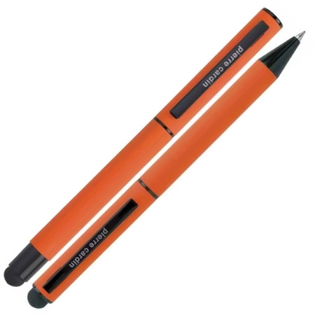 Zestaw piśmienniczy w modnych, intensywnych kolorach, składający się z długopisu oraz pióra kulkowego. Obydwa artykuły posiadają przyjemną w dotyku powierzchnię soft touch i czarne detale oraz funkcję touch pen. Długopis wyposażony w niebieski wkład (0,7
