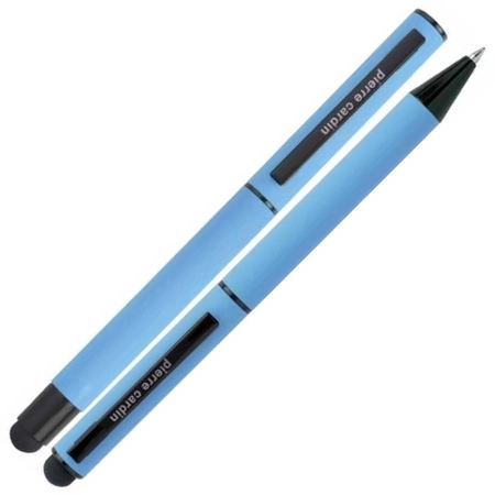 - Zestaw piśmienniczy w modnych, intensywnych kolorach, składający się z długopisu oraz pióra kulkowego. Obydwa artykuły posiadają przyjemną w dotyku powierzchnię soft touch i czarne detale oraz funkcję touch pen. Długopis wyposażony w niebieski wkład (0,7
