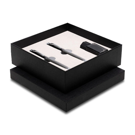 - Elegancki zestaw piśmienniczy składający się z metalowego pióra wiecznego, długopisu oraz buteleczki z niebieskim atramentem. Całość pakowana w pudełko upominkowe.