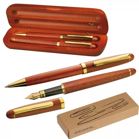 Zestaw składający się z długopisu z niebieskim wkładem oraz pióra wiecznego z dołączonym niebieskim nabojem. Funkcjonalne pudełko z drewna różanego po zamknięciu może służyć jako podstawka.