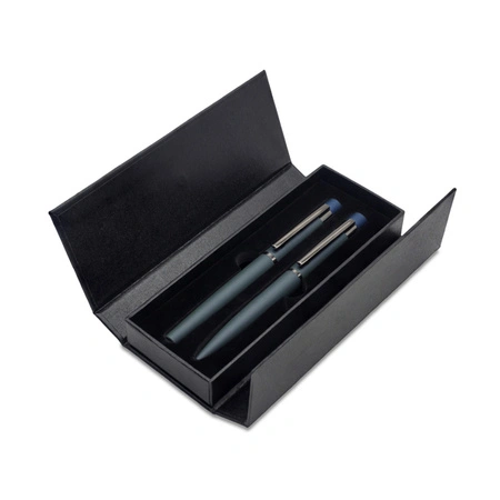 - Zestaw piśmienniczy składający się z metalowego pióra kulkowego i długopisu. Wkład w kolorze niebieskim. Zapakowany w upominkowe opakowanie.