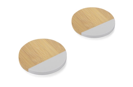 Dwie eleganckie podkładki pod kubek z bambusa i sztucznego marmuru. Wytrzymałe, odporne na uszkodzenia, idealne do wielu wnętrz. Zapakowane w kraftowe pudełko.