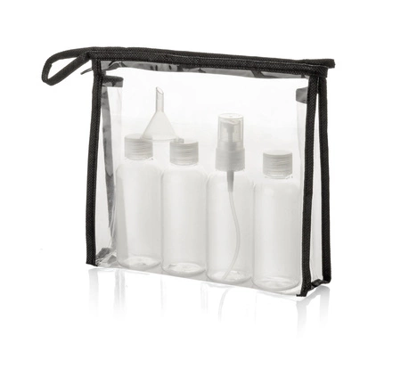 - Travel container set is a handy gadget for trips, allowing you to bring your favorite cosmetics in smaller bottles. Includes 4 80ml bottles, one with a spray nozzle, and a funnel for easy transfer.