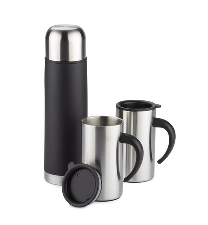 Zestaw podróżny z termosem 500 ml, kubeczkiem 90 ml i 2 kubkami termicznymi 260 ml. Pakowany w czarny kartonik, z możliwością grawerowania loga na powierzchni. Idealny na podróże.