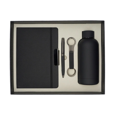 - Elegancki zestaw upominkowy zawiera: butelkę próżniową o pojemności 350 ml, notes 80-kartkowy w linię (papier 80 g/m²) w twardej okładce, ozdobiony metalowym akcentem, z tasiemką indeksującą. Długopis (niebieski wkład) oraz brelok. Całość zapakowana w ele